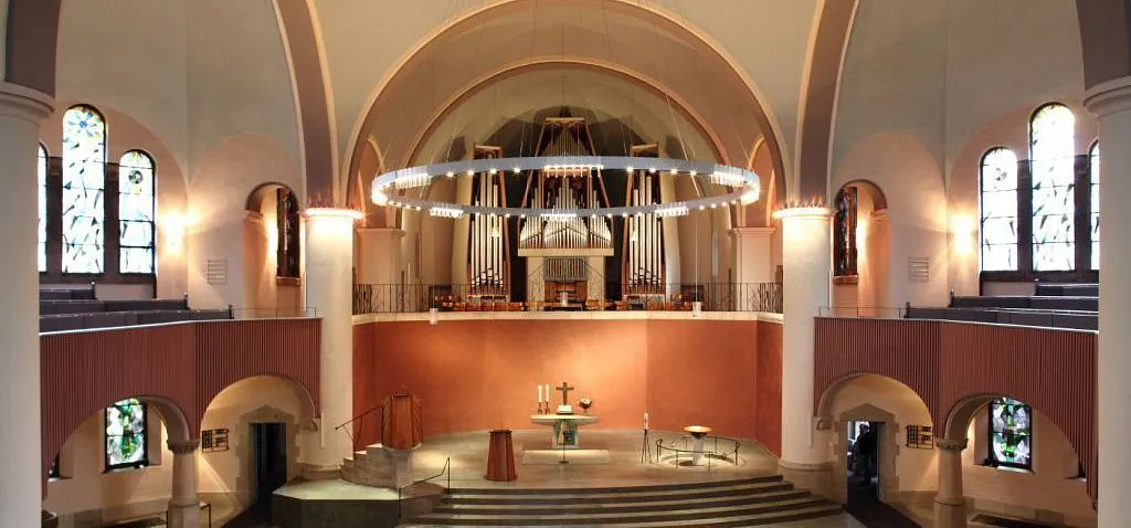 Im zweiten Weltkrieg total zerstört, wurde die Kirche in den 50er Jahren außergewöhnlich geschmackvoll und wohl durchdacht umgestaltet. Der bekannte Pädagoge und „Handwerksphilosoph“ Hugo Kükelhaus entwarf dieses Interieur unter Beachtung auch kleinster Details.