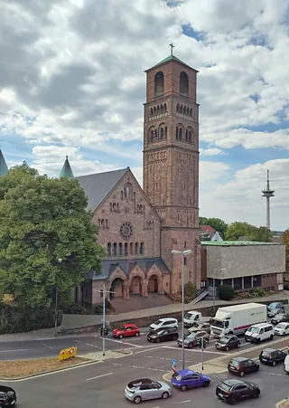 Franz von Schwechten, Leibarchitekt Kaiser Wilhelms II, baute diese Kirche in den Jahren 1905 bis 1909 im neoromanischen Stil als Mittelpunkt des damals neu entstehenden Südviertels. Auffällig sind der Glockenturm, der – an einen italienischen Campanile erinnernd – neben dem Kirchenschiff steht und schon von weitem zu sehen ist, sowie die beiden Chortürme an der Rückseite des Gebäudes.