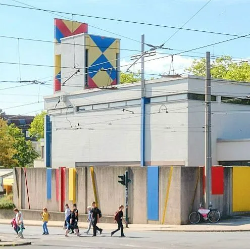 Mit seinem schlichten hohen Metallkreuz bildet das MGZ eine Ruhe-Insel innerhalb des quirligen Wohn- und Einkaufsquartiers.
